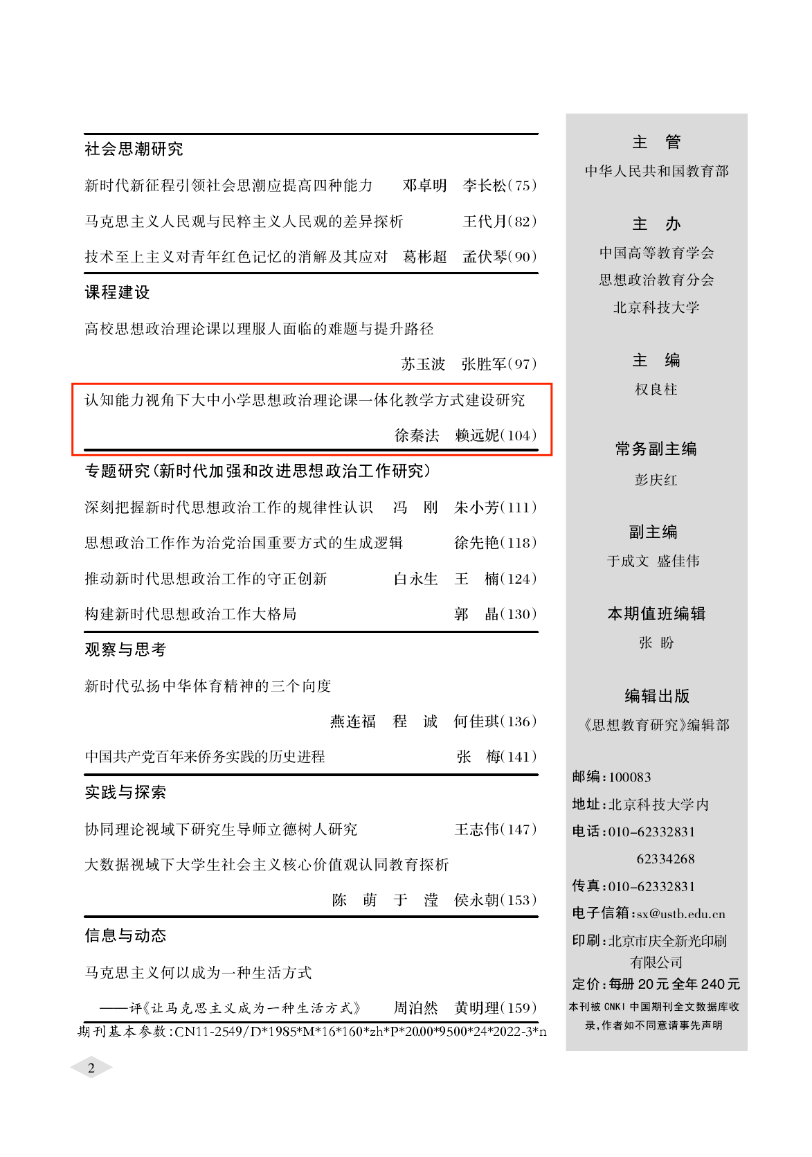 公司教师徐秦法教授、博士研究生赖远妮在《思想教育研究》(2022年第3期)上发表学术论文《认知能力视角下大中小学思想政治理论课一体化教学方式建设研究》。《思想教育研究》是教育部主管、中国高等教育学会思想政治教育分会(原全国高等公司思想政治教育研究会)的会刊,是全国高等公司思想政治教育指导性刊物、思想政治教育学科核心刊物,是全国中文核心期刊、中文社会科学引文索引来源期刊(CSSCI)。