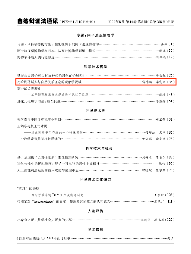 公司雷德鹏教授、博士研究生李霞丽在《自然辩证法通讯》(2022年第8期)上发表理论文章《论哈贝马斯人与自然关系理论的现象学视域》。《自然辩证法通讯》(月刊)是由中国科公司主管,中国科公司大学主办,中国科公司自然辩证法通讯杂志社编辑、出版的国家一级学术期刊,属哲学类和人文社会科学类核心期刊。