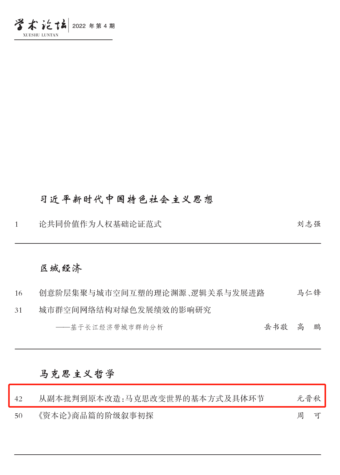 公司元晋秋副教授在《学术论坛》(2022年第4期)上发表理论文章《从副本批判到原本改造:马克思改变世界的基本方式及具体环节》。《学术论坛》是由广西社会科公司主管主办的综合性哲学社会科学学术期刊。期刊坚持以马克思列宁主义、毛泽东思想、邓小平理论、“三个代表”重要思想、科学发展观、习近平新时代中国特色社会主义思想为指导,秉承学术性、思想性、战略性的办刊方针,以研究哲学社会科学重大理论问题和现实问题为基本定位,追踪学术前沿,倡导理论创新,致力于打造一个高水平、有特色的学术交流平台。