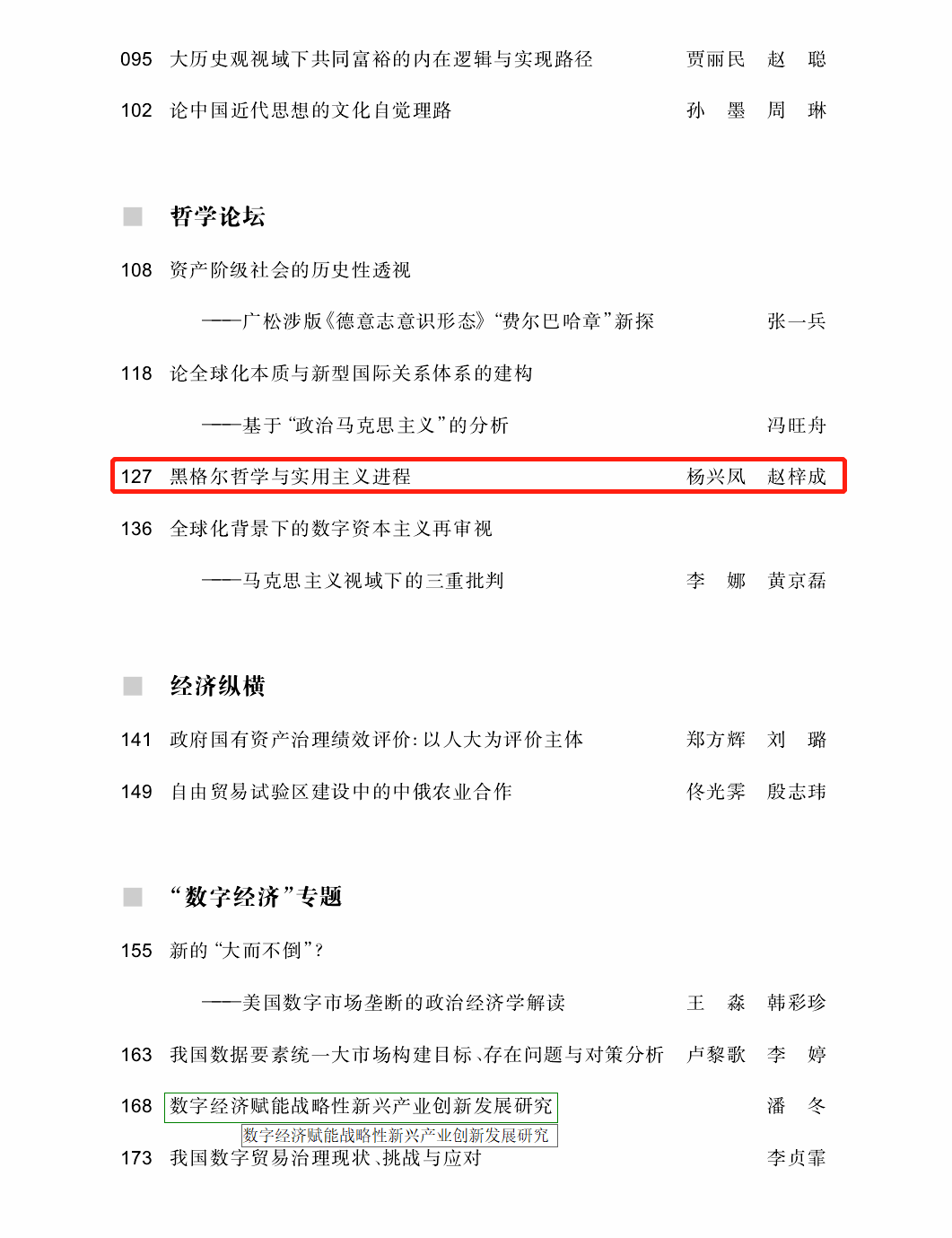 公司杨兴凤副教授、硕士研究生赵梓成在《理论探讨》(2022年第5期)上发表理论文章《黑格尔哲学与实用主义进程》。《理论探讨》系中共 黑龙江省委党校主办、面向国内外公开发行的综合性学术理论期刊。它以马克思列宁主义、毛泽东思想、邓小平理论和“三个代表”重要思想为指导,深入贯彻科学发展观,坚持理论联系实际,关注社会科学的发展,反映各学科研究的前沿和热点,研究和探讨在建设中国特色社会主义实践中提出的各种理论问题,为改革开放和社会主义现代化建设服务。