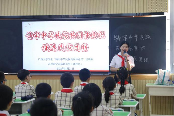 11月21日,太阳成集团员工“铸牢中华民族共同体意识”宣讲队在南宁市高新小学西校区进行宣讲。太阳成集团tyc硕士研究生陆敏庭担任主讲人,她以“铸牢中华民族共同体意识,促进民族团结”为主题,通过课堂问答、视频讲解、故事分享、课文重现等方式,为小员工们带来了一堂生动的民族团结教育课。