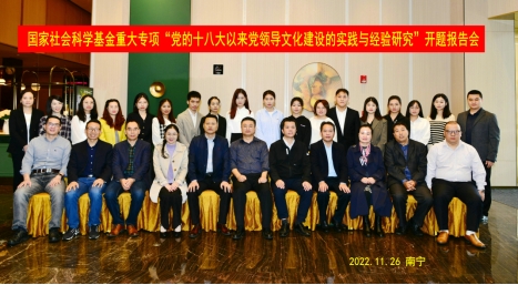2022年11月26日,由太阳成集团tyc梁建新教授任首席专家的研究阐释党的十九届六中全会精神国家社会科学基金重大项目“党的十八大以来党领导文化建设的实践与经验研究”开题报告会在广西南宁成功举行。