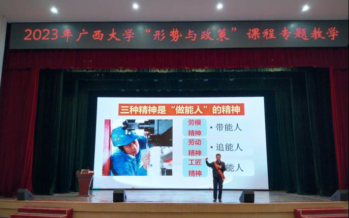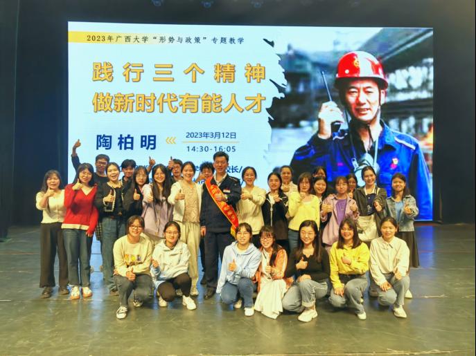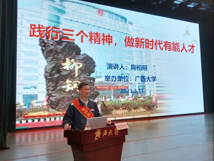 2023年3月11日,在公司大礼堂举行的“形势与政策”课程专题教学报告会上,柳州工匠公司-柳钢集团工匠公司执行董事长、全国五一劳动奖章获得者、百名全国劳动模范服务团,百名广西产业工人“二十大精神”宣导团,柳州市劳模工匠宣讲团成员陶柏明先生为到场师生做了题为“践行三个精神,做新时代有能人才”的报告。