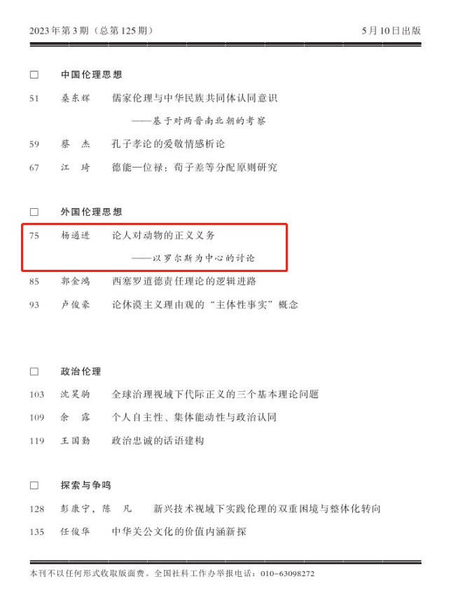 公司教师杨通进在《伦理学研究》(2023年第3期)上发表理论文章《论人对动物的正义义务——以罗尔斯为中心的讨论》。