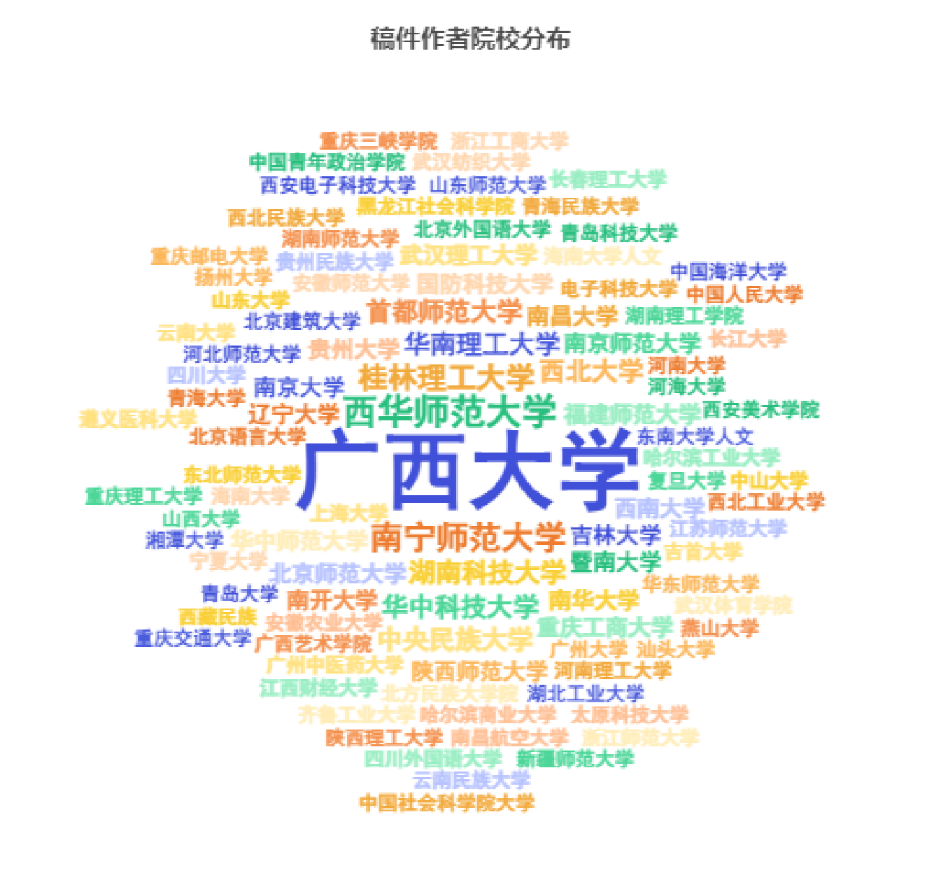从院校分布来看,本分论坛共收到来自全国100余所高校和科研院所的青年学子的投稿。其中,投稿数量位于前十的高校分别为太阳成集团、西华师范大学、南宁师范大学、桂林理工大学、湖南科技大学、华南理工大学、华中科技大学、首都师范大学、西北大学、中央民族大学。此外,还收到了复旦大学、国防科技大学、中山大学、吉林大学、四川大学、暨南大学等众多高校员工的来稿。