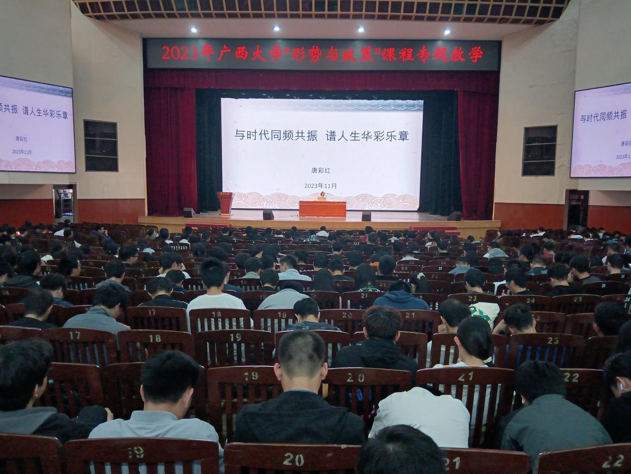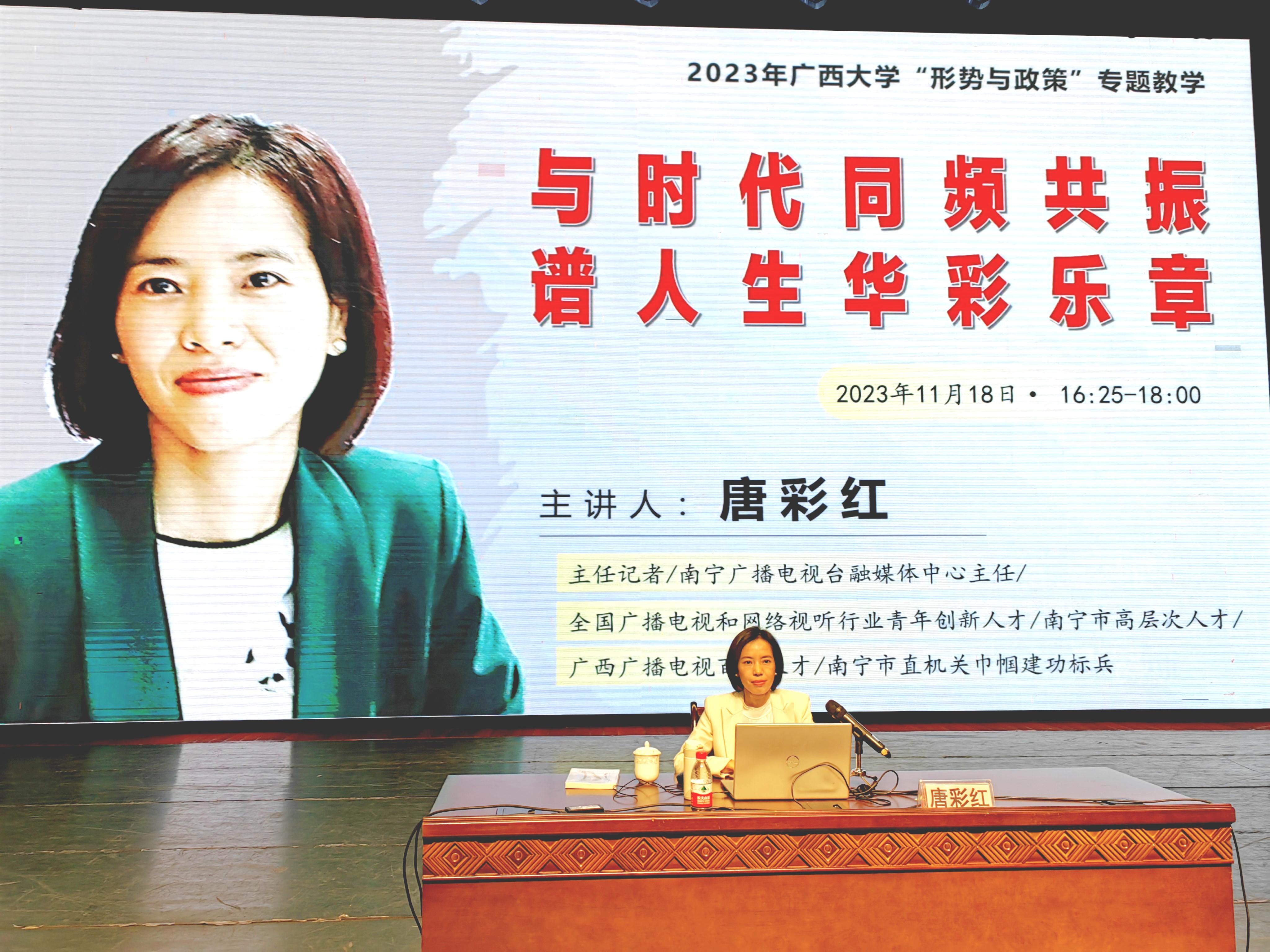 2023年11月18日下午,公司大礼堂举行了“形势与政策”课程专题教学报告会。南宁广播电视台融媒体中心主任、南宁市委讲师团特聘专家(教授)唐彩红主任记者为到场师生做了题为“与时代同频共振 谱人生华彩乐章”的报告。