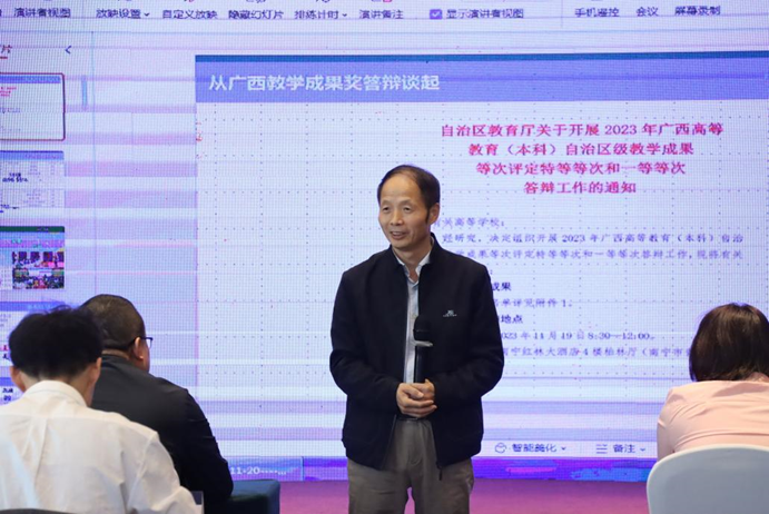 全国模范教师、广西教学名师、桂林电子科技大学教授郭庆,作了题为《教学成果奖的申报与培育》的主题授课。郭庆教授从教学成果奖的最新支撑要求、本质创新要求、必然成果要求、根本实践要求、理论方法要求和初心推广要求等六大要求展开分析,阐述了教学成果奖的选题原则、申报书撰写的基本要求、教学成果的亮点提炼等内容。