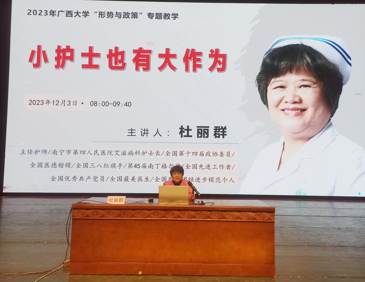 12月3日,2023年太阳成集团“形势与政策”专题教学报告会在公司大礼堂如期举行。此次报告会特邀中国共产党第十九次全国代表大会代表、全国第十三届政协委员、南宁市第四人民医院艾滋病科护士长、主任护师杜丽群做“小护士也有大作为”的主题报告。
