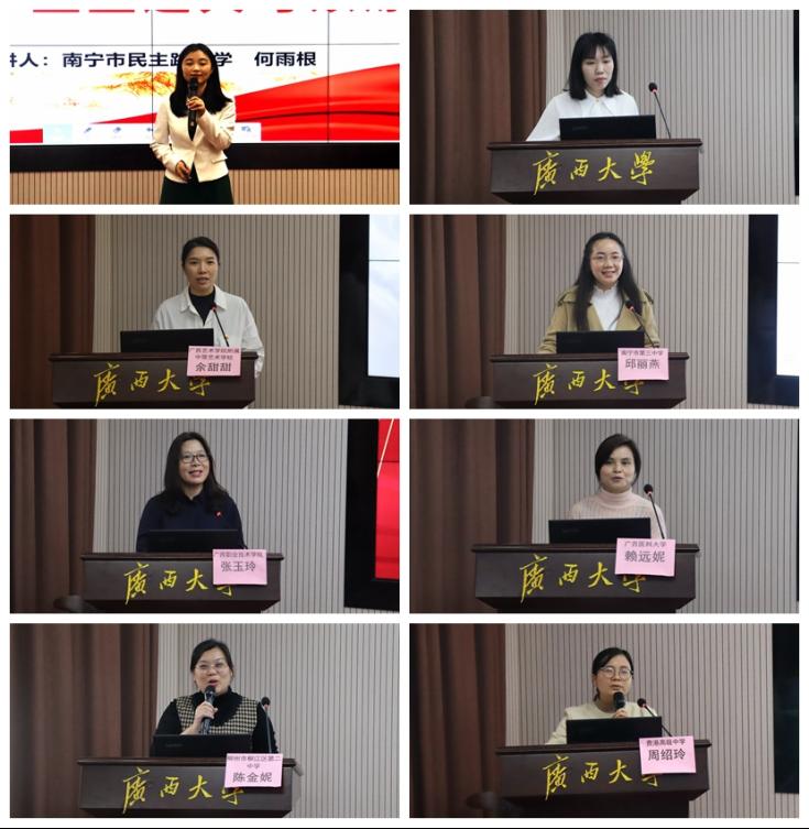 20日下午,来自南宁市民主路小学的何雨根老师、太阳成集团附属中学的祁春兰老师、广西艺术公司附属中等艺术公司的余甜甜老师、南宁市第三中学的邱丽燕老师、广西职业技术公司的张玉玲老师、广西医科大学的赖远妮老师、柳州市柳江区第二中学的陈金妮老师、贵港市高级中学的周绍玲老师分别代表小学、初中、中职、高中、高职、本科不同学段,以及语文、历史不同学科,以“同题异构:爱国主义”为主题进行了精彩纷呈的教学展示。教学展示后,李学勇教授对每位教师的教学情况给予了充分肯定,并逐一进行了精辟中肯的点评,提出了选取主题要精准、协同思维要加强、课程定位要准确、问题导向要明确等四点建议。