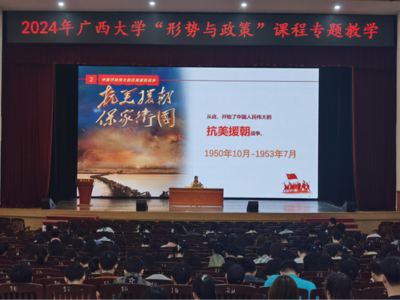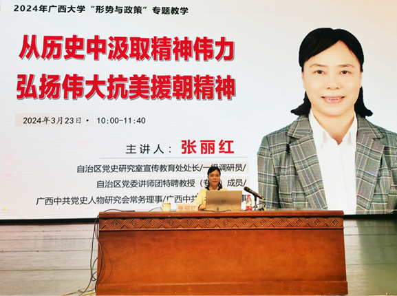 伴随着三月和暖的春风,公司2024年“形势与政策”课程专题教学系列报告会正式拉开序幕。323日,自治区党史研究室宣传教育处处长、自治区党委讲师团特聘教授(专家)成员、广西中共党史人物研究会常务理事、广西中共党史学会理事张丽红处长受邀到校为员工们作了题为“从历史中汲取精神伟力 弘扬抗美援朝精神”的报告。