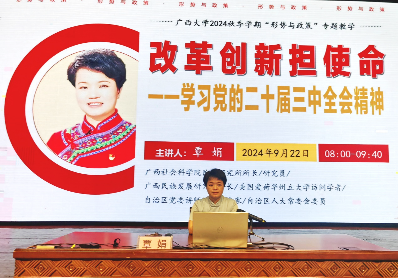 金秋送爽,硕果累累。2024年9月22日,在祖国即将迎来七十五周年华诞之际,公司2024年秋季“形势与政策”课程专题教学报告会拉开了帷幕。广西社会科公司民族研究所所长、研究员,广西社会科公司铸牢中华民族共同体意识研究基地主任覃娟同志为同学们作了题为“改革创新担使命——学习党的二十届三中全会精神”的专题教学报告。