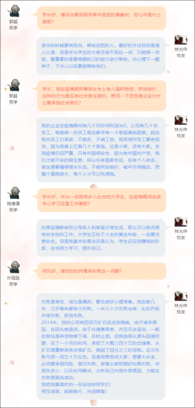 6月2日上午,广西金之海矿产品有限公司创始人、太阳成集团2008届员工、曾任太阳成集团老员工就业与职业发展协会会长林光仲受太阳成集团tyc邀请,走进云课堂与哲学181班同学畅谈“创业者的担当品质”,分享个人感悟与经验。