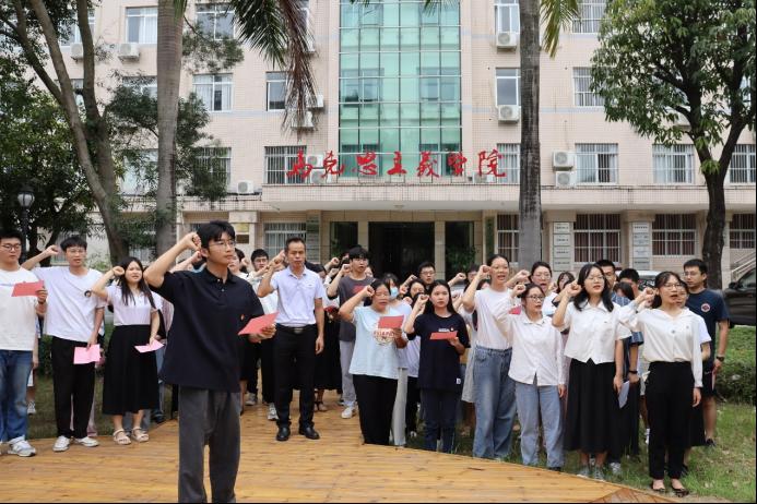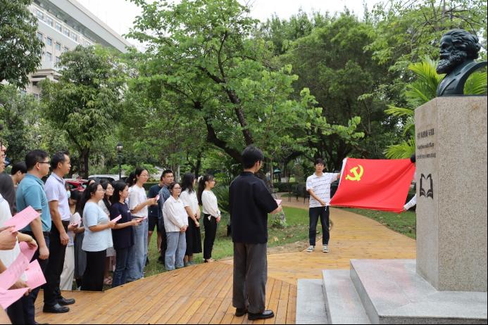 最后,全体党员同志移步马克思广场进行入党宣誓仪式。在宋宇轩同志的领誓下,全体同志举起右拳,面对着鲜红的党旗庄严宣誓。在铿锵有力的宣誓中,党员同志们更加坚定了永远跟党走的信心和决心。