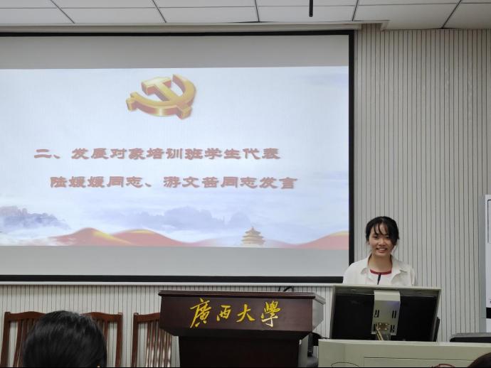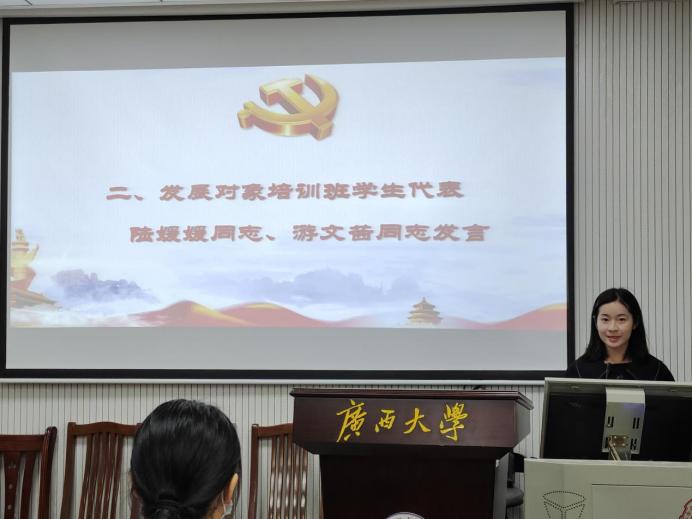 随后,研究生陆媛媛、本科生游文茜作为发展对象培训班学员代表分别进行了表态发言,她们表示将珍惜来之不易的学习机会,严格遵守培训班纪律、坚决遵照培训班要求,切实提高政治站位,积极参加学习活动,认真完成学习任务,自觉争当学习表率,主动接受党组织的培养、教育和考察,以实际行动争取早日入党。