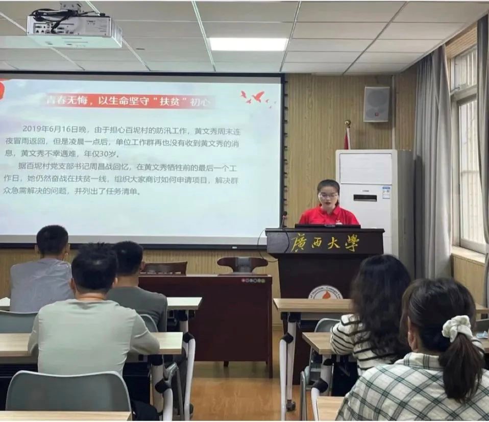 在宣讲中,主讲人方豆豆以《汲取“文秀精神”,诠释青年品格》为主题,从脱贫攻坚、文秀精神以及寄语青年三个方面开展了宣讲,聚焦广西的好女儿黄文秀同志的感人事迹,生动阐释了“脱贫攻坚精神”和“文秀精神”。最后,方豆豆号召在场的员工党员们坚定理想信念,肩负使命担当,勤学善思笃行、永怀为民之志,把个人的“小我”融入祖国的“大我”中,为建设社会主义现代化国家贡献自己的青春力量。