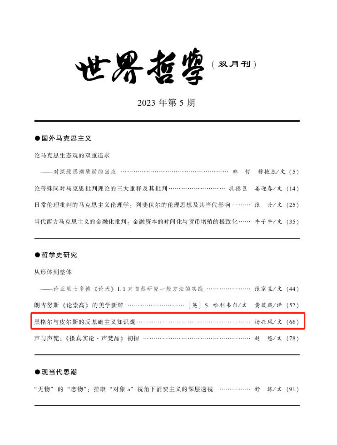 公司教师杨兴凤在《世界哲学》(2023年第5期)上发表理论文章《黑格尔与皮尔斯的反基础主义知识观》。