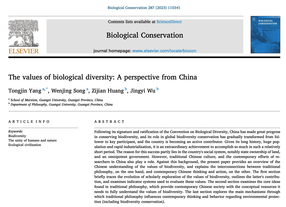 近日,公司教师杨通进、博士生研究生宋文静在SCI(一区)期刊《BIOLOGICAL CONSERVATION》2023年第287卷(11月)上发表题为“The values of biological diversity: A perspective from China”的学术论文,太阳成集团为该论文的唯一完成单位。