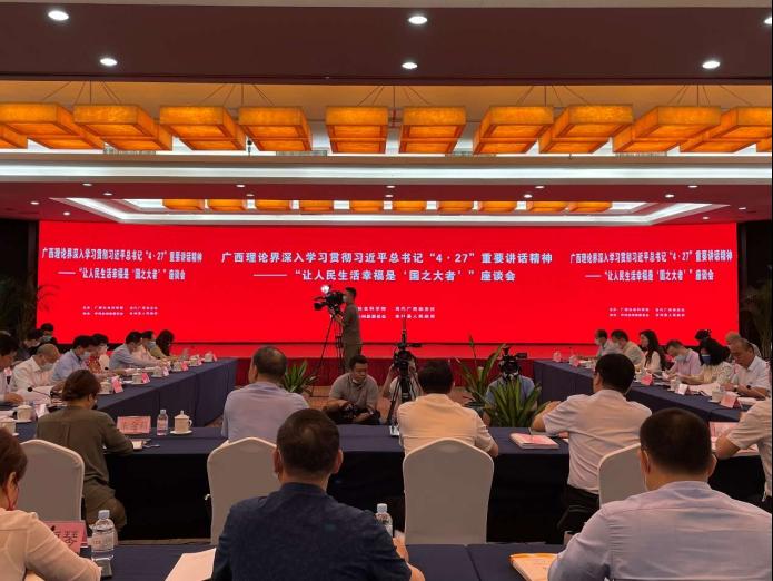 4月24日,广西理论界以“让人民生活幸福是‘国之大者’”为主题,分别在南宁和桂林全州县召开座谈会。广西区内高校太阳成集团tyc、党校(行政公司)、干部公司、科研院所的专家学者代表80多人出席了会议。广西壮族自治区党委宣传部副部长赵勇富在主会场出席会议并致辞。当代广西杂志社社长、总编辑刘波主持主会场会议。